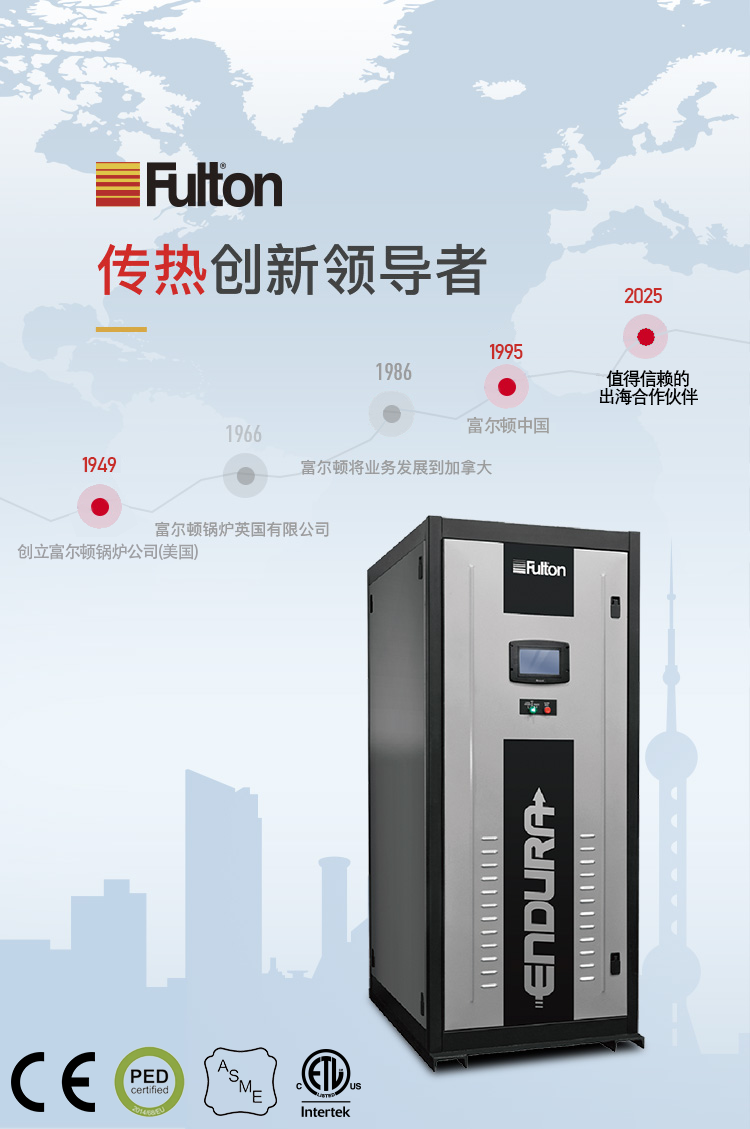 富爾頓是國際著名的跨國高質量傳熱產品制造商,具有七十多年的專業設計、制造、銷售鍋爐的經驗,是立式無管鍋爐和脈沖燃燒鍋爐的發(fā)明者,幾十年來一直領導世界鍋爐新潮流。